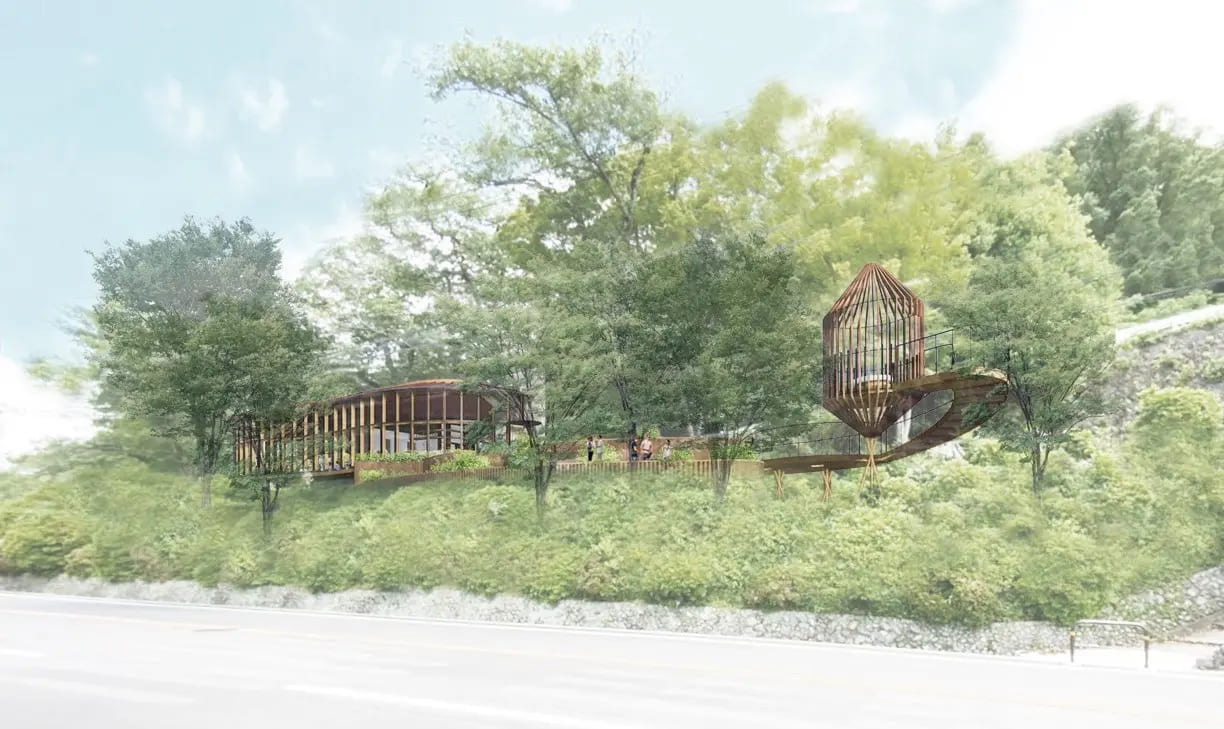 五月山の丘に元から立つ木々を可能な限り残し、自然の地形に寄り添うように設計された「丘の上のレストラン」。まるで森の中にリビングを持ち出したような開放的な空間には大きな窓を配置し、大阪平野の絶景と木々の緑がシームレスにつながる、非日常感あふれるアウトドアリビングに。