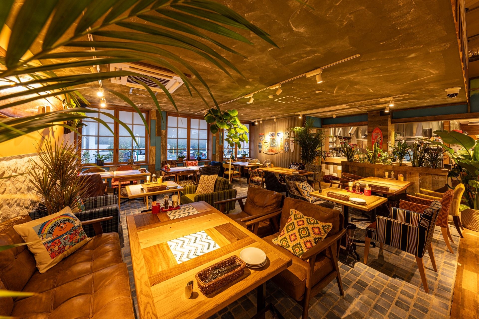 カラフルなハワイアン雑貨やサーフボードが飾られ、遊び心のあるソファやテーブルなどのこだわりのインテリアが、まるで、ハワイのローカルのリビングにいるような雰囲気を演出します。ゆったりとくつろげる空間で、日本にいながらハワイ気分を味わえます。