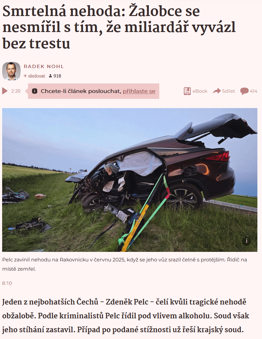 https://www.seznamzpravy.cz/clanek/domaci-kauzy-smrtelna-nehoda-zalobce-se-nesmiril-s-tim-ze-miliardar-vyvazl-bez-trestu-303604 Czech Republic