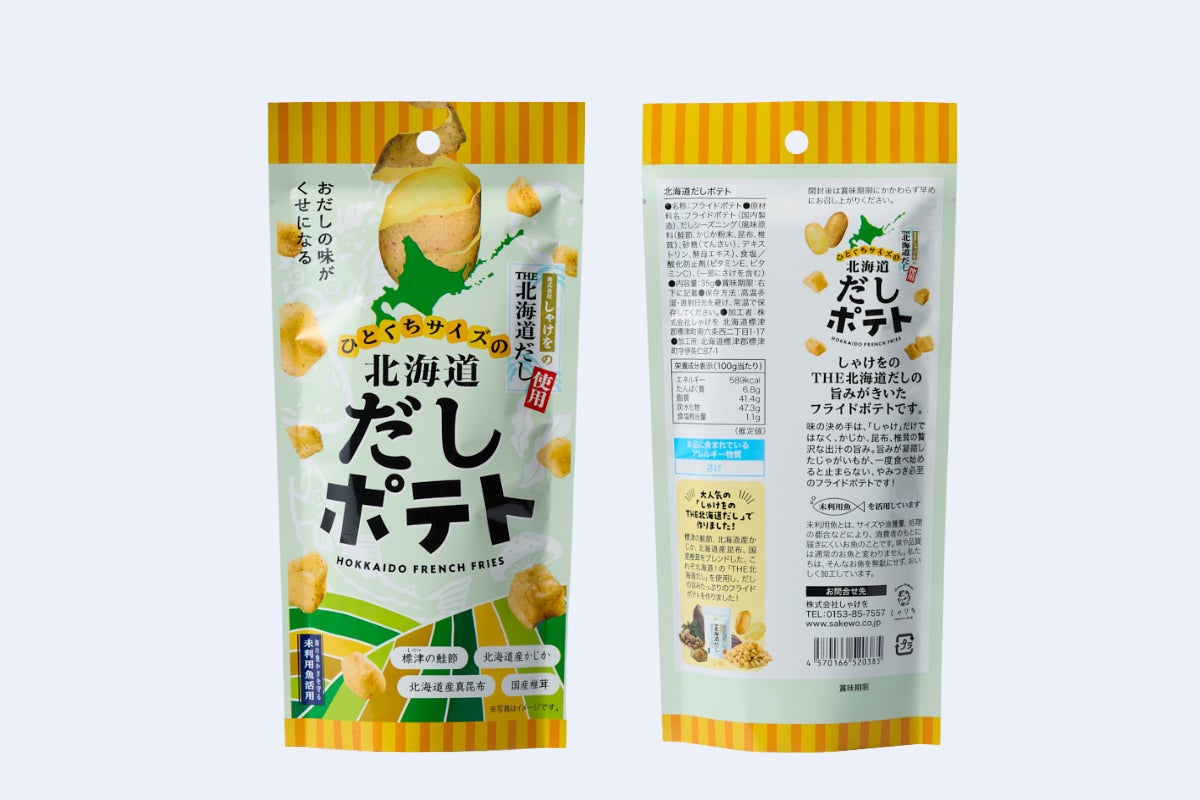 『北海道のだしポテト』は、北海道産のじゃがいもを使用したフライドポテトを『しゃけをのTHE北海道だし』で味付けした新商品です。チップス型やスティック型なども検討しましたが、一口で食べやすく、食感も楽しめるサイコロ型を採用しました。