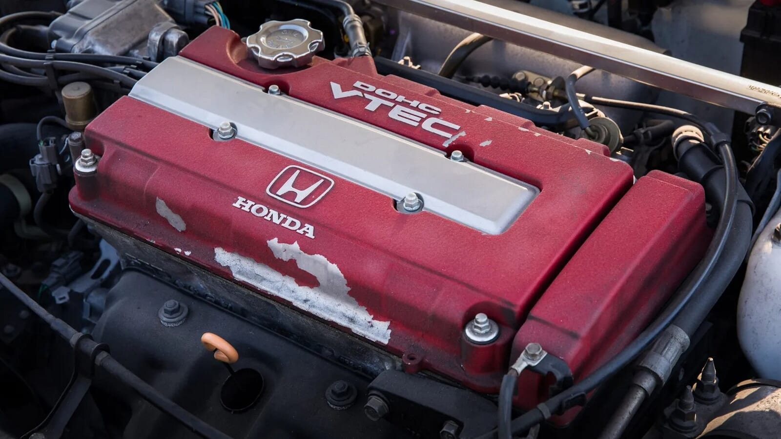 この車(写真の広報車)はホンダのヘリテージフリート(歴史的車両のコレクション)のものだ。20年前のエンジンブロックからは塗装が剥がれ落ちているかもしれないが、VTECは今でもどうやって(高回転で)キックインするかを熟知している。