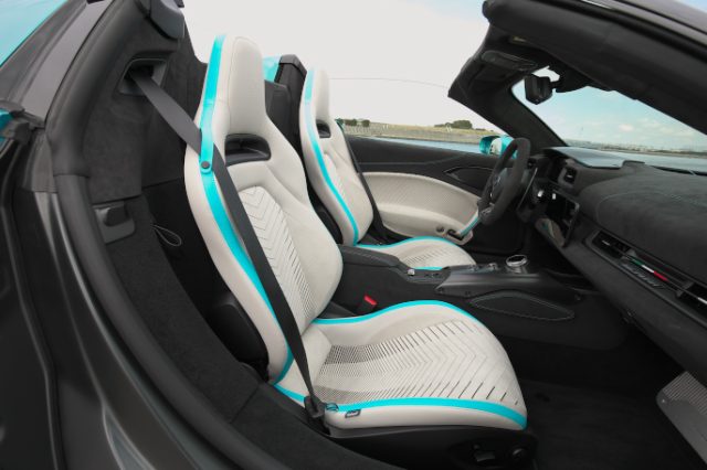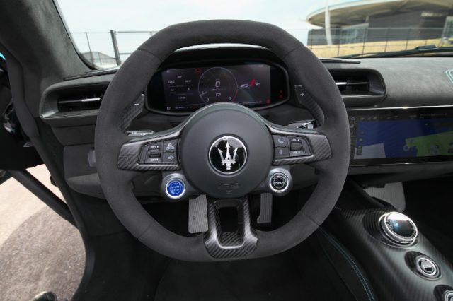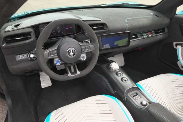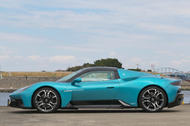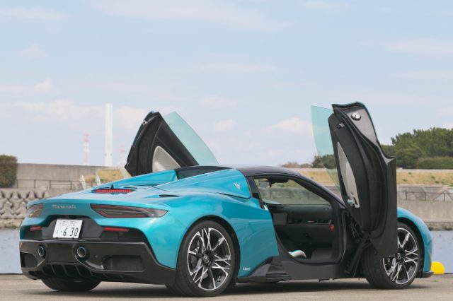 開発当初から、クーペ、スパイダー、フルエレクトリックのすべての車型に対応できるようにデザインされた車体はカーボンファイバーを多用。個性的なフォルムはマセラティ初のバタフライ・ドアを備えている。このドアは乗りこむときは腕を伸ばし、ドアを引き下げ、降りるときはハネ上げる方式。