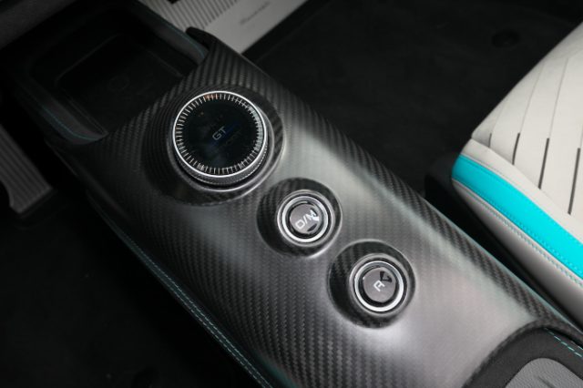 大きなダイヤルはドライブモード選択用。その下にD/M、Rの変速用ボタン。インテリアはオプションのカーボンパッケージ(72万円)。