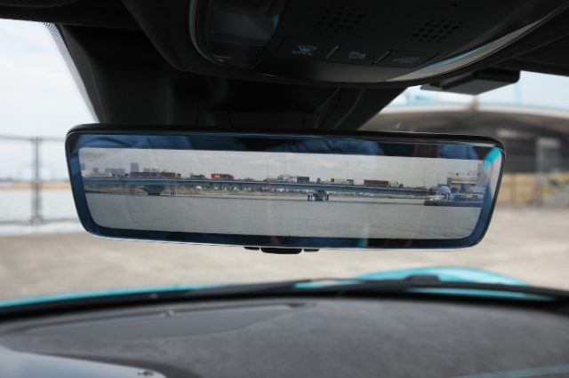 リアウインドが小さく、後方視界の確保は、リアカメラによるデジタルルームミラーが装備されている。ワイド視界のミラーはナナメ後方に忍びよる白いオートバイも確認できる。