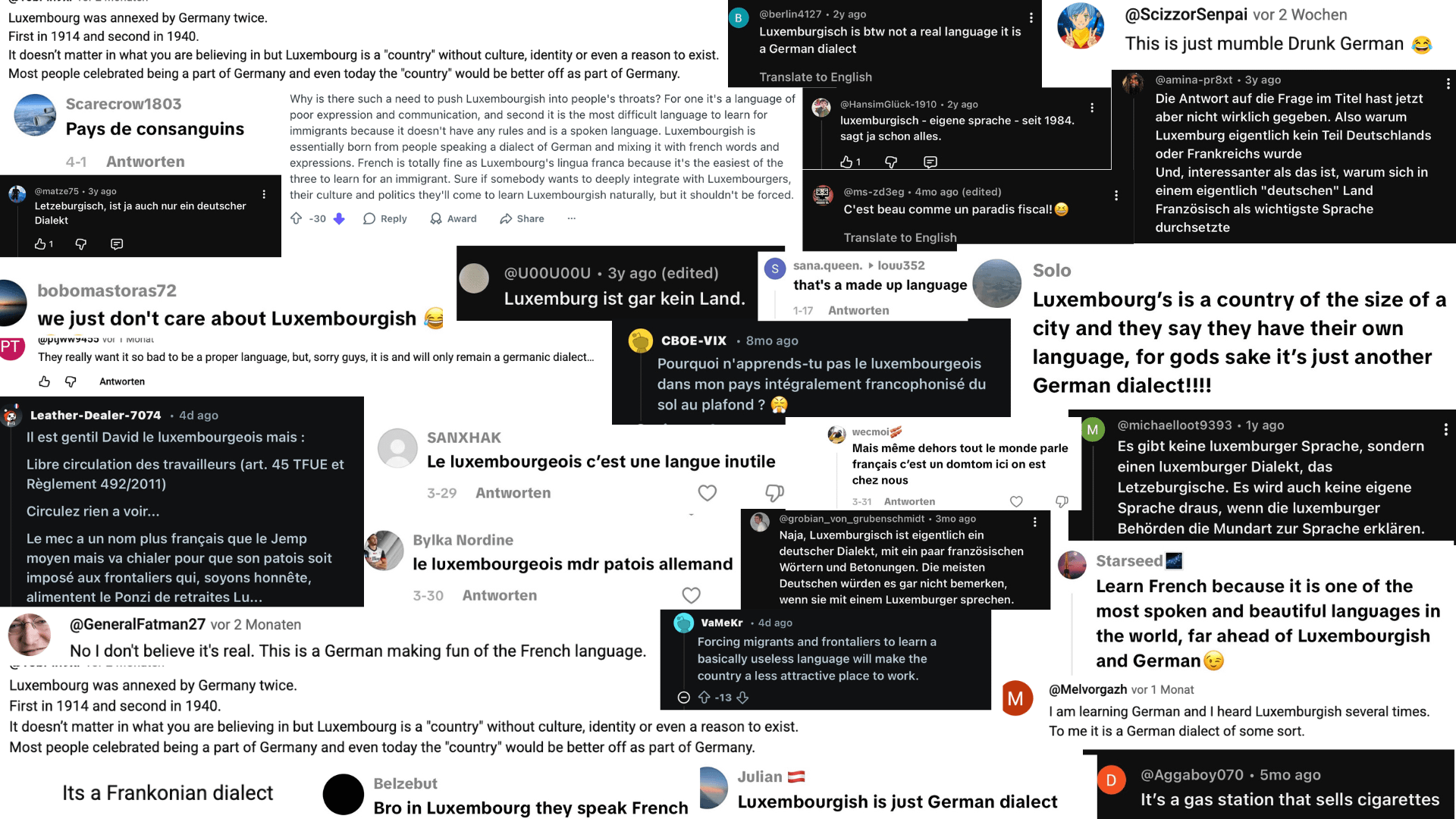 この目的のために、私はさまざまなプラットフォームからのさまざまなコメントを含むいくつかの大規模なパネルを作成しました。これは何よりも、ルクセンブルクの歴史、アイデンティティ、言語に関するメディアに対する反応として見られます。これらのコメントを個別に見ると、単なる無知、憎悪、または荒らしのコメントとして無視するのは簡単です。 "怒りの餌"、それは反応に値しませんでした。
