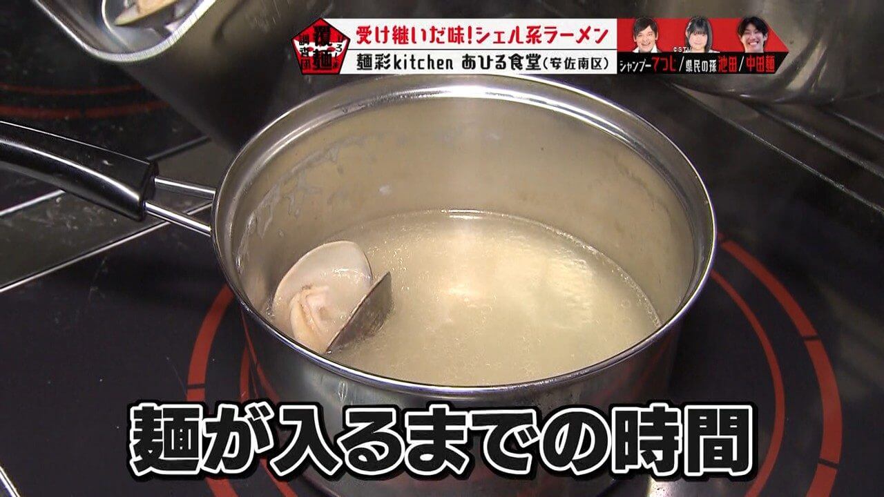 実は、麺を茹で始める前の時間に、ハマグリを煮出していたのです。この煮出したハマグリはそのまま具材として入れています。
