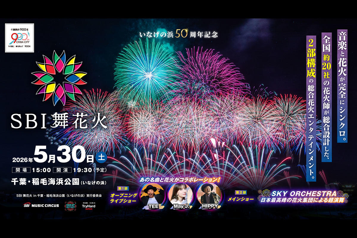 SBI舞花火 in 千葉・稲毛海浜公園(いなげの浜)feat. SKY ORCHESTRAが、2026年5月30日(土)に千葉市美浜区の稲毛海浜公園にて開催されます。SBI舞花火実行委員会および株式会社TryHard Japanが主催する同イベントは、大阪で育まれてきた”泉州夢花火”の系譜を継ぐ花火イベントとして、千葉での初開催となります。