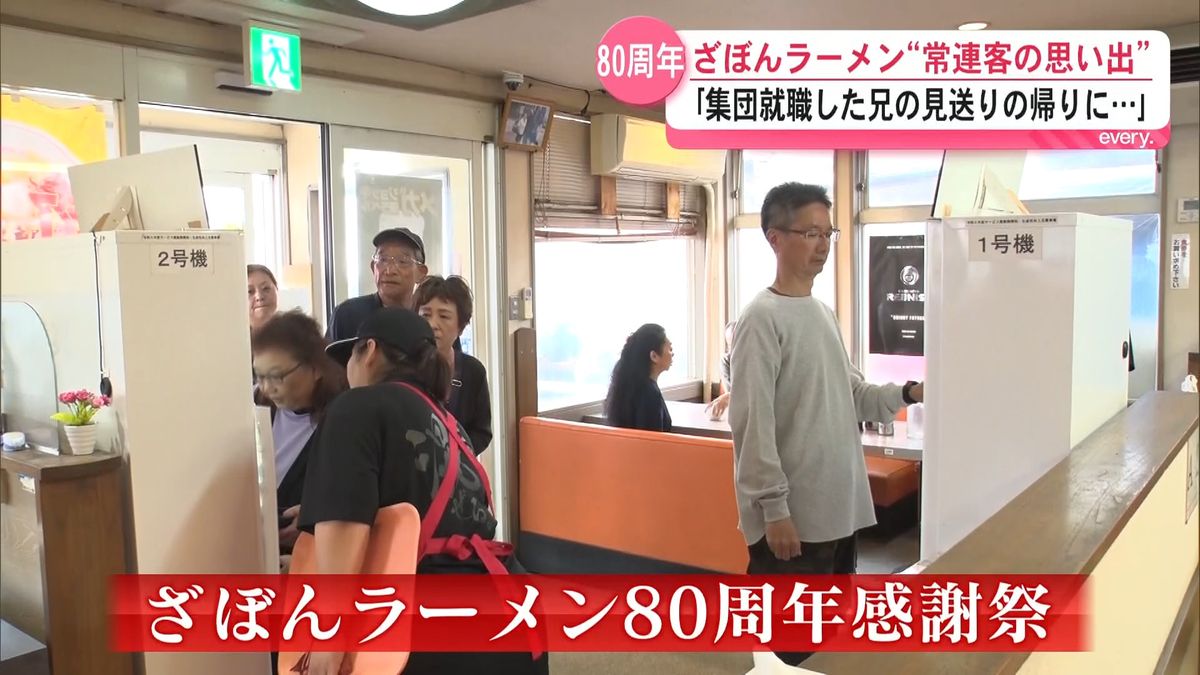 予定より20分早くオープンして始まった80周年の感謝祭。県内7店舗を展開するざぼんラーメンの15日だけの大サービスです。普段は980円のラーメンが600円で提供されます。