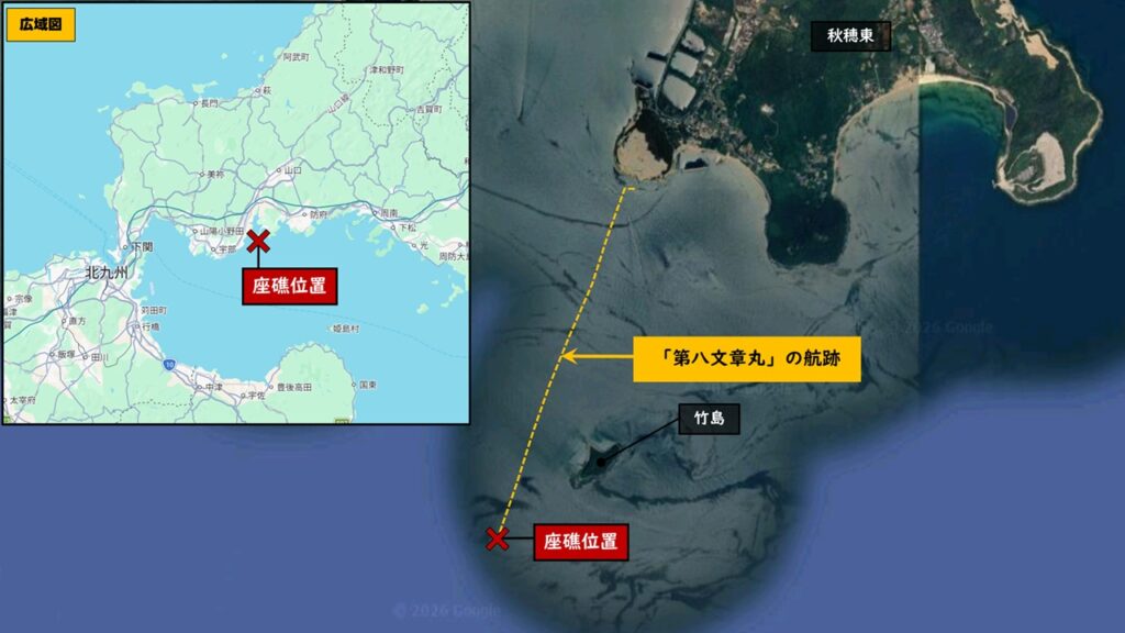 ガット船「第八文章丸」のAIS情報によると、4月15日08時ごろに山口市秋穂に到着。その後、同日10時30分ごろに秋穂を出発し、大分県津久見へ向けて航行を開始した直後に山口市秋穂沖の竹島南西で座礁。座礁した場所は潮が引いたときには岩場が現れる海域だった。