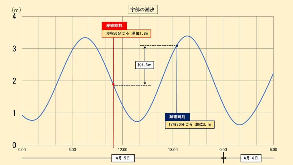 ガット船「第八文章丸」のAIS情報によると、座礁からおよそ8時間後の4月15日18時30分ごろ離礁に成功。秋穂に近い宇部の潮汐を確認すると、座礁時の潮位は1.8m。離礁時は潮位3.1m。