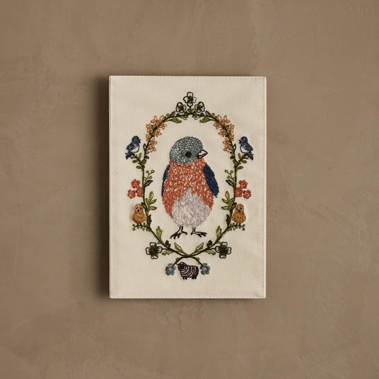 愛らしい青い鳥の雛を中心に、草花やひよこ、小さな鳥、子羊たちが囲む情景を刺繍で表現。やわらかな色彩と繊細なステッチが、あたたかな物語を感じさせます。