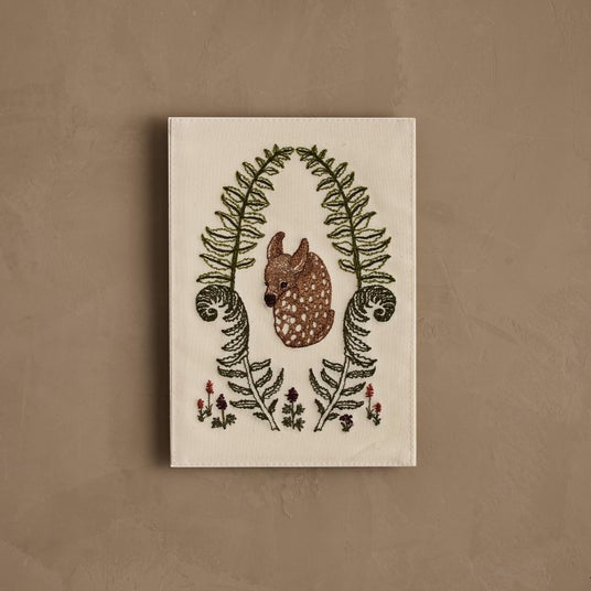 シダの茂る草原にたたずむ子鹿の姿を、やさしいタッチの刺繍で表現したカード。静けさの中に愛らしさを感じさせるデザインが魅力です。
