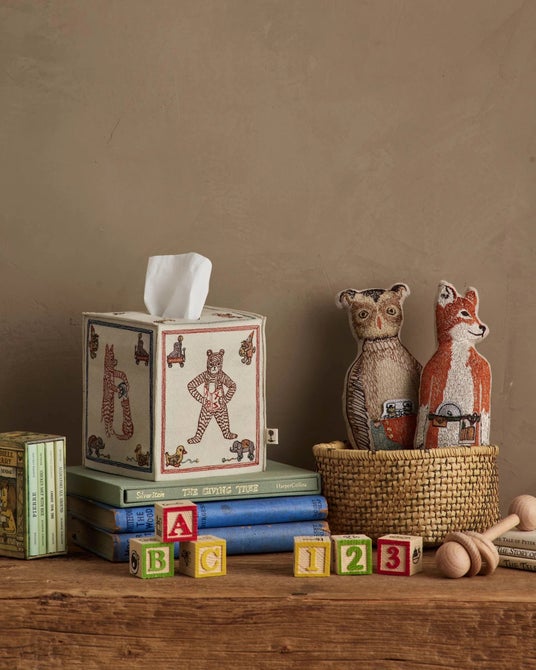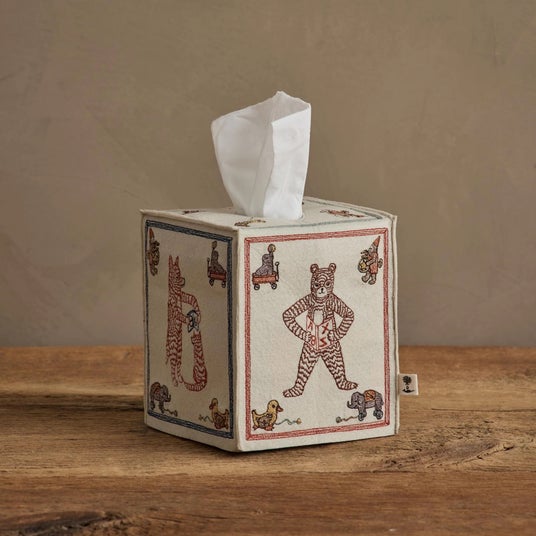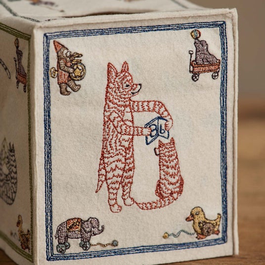 アメリカの伝統的な「ABCブロック」から着想を得たティッシュボックスカバー。書籍『ABC: An Animal Alphabet Adventure』を読む動物たちの姿を、刺繍で丁寧に表現しました。フェルト素材ならではの柔らかな質感と、どこか懐かしさを感じるデザインが魅力です。