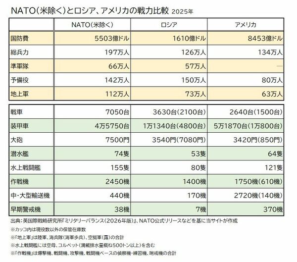 アメリカのNATO脱退が現実となれば、NATOのダメージは計り知れない。現在、加盟国は全32カ国だが、別掲表を見ても分かるようにアメリカ1国と、残り31カ国の戦力を比べると、大半の項目で互角かアメリカの方が上で、桁外れに強大だ。