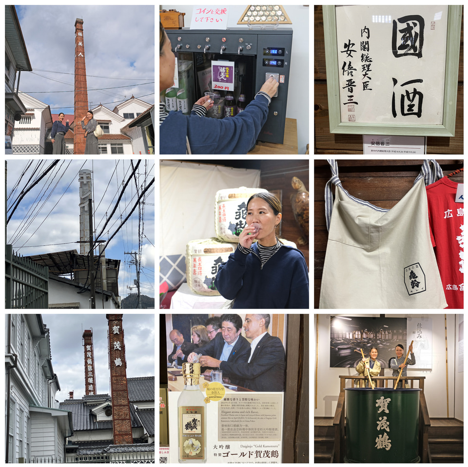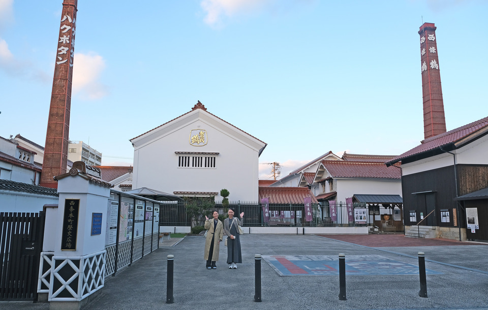 灘、伏見と並び日本三大銘醸地の一つ西条は、空港からのアクセスにも優れ、西条特有の赤瓦や赤レンガの煙突、そして格子模様の白い壁が続くノスタルジックな風景が続きます。8つの酒蔵、見どころが徒歩圏内にあるというのもうれしいポイントです。