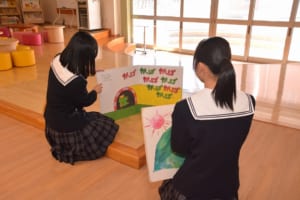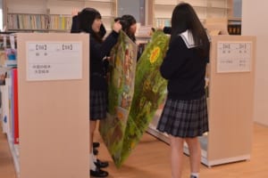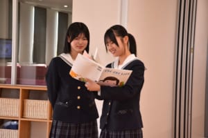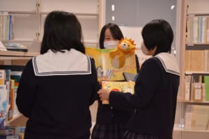 図書館では、絵本コーナーを中心に見学を行い、生徒たちは懐かしい絵本を手に取りながら友人に読み聞かせをしたり、大型絵本に驚いたりと、楽しみながら大学の雰囲気を体感していました。