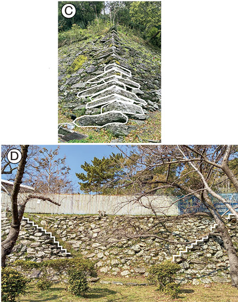 Ⓒ石垣の角部分を補強する積み方「算木積み」。長方形の石を互い違いに組み合わせている(写真は鶴の渓) Ⓓ岡口門近くにある、野面積みで階段状に積み上げた「雁木」