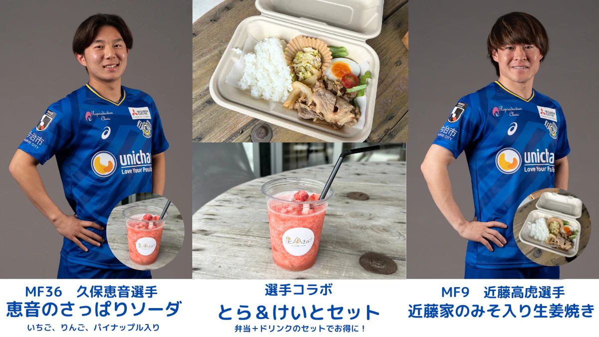 選手コラボメニューが2品登場!近藤選手コラボの定食弁当「近藤家のみそ入り生姜焼き」は、隠し味に味噌を入れた、コクのある生姜焼きをお楽しみいただけます。久保恵音選手コラボのドリンク「恵音のさっぱりソーダ」は、いちご、りんご、パイン入りのすっきり飲めるフルーツソーダ。お肌に嬉しい栄養素が詰まった、ビューティーDAYにピッタリのドリンクになっています。