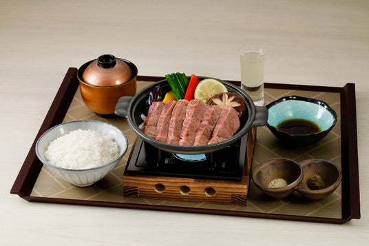 おおいた 三味丼~おおいた和牛・九重夢ポーク・冠地鶏~2,709円(税込2,980円)「おおいた和牛」のステーキと「おおいた冠地どり」のとり天に加え、「九重夢(ここのえゆめ)ポーク」のステーキを一度に愉しめる丼ぶりです。色鮮やかな野菜を添えて、彩り豊かに仕上げました。別添えの香り豊かな「かぼす塩」や「かぼすこしょう」が、お肉の旨味を際立たせ、最後の一口まで飽きることなくお愉しみいただけます。