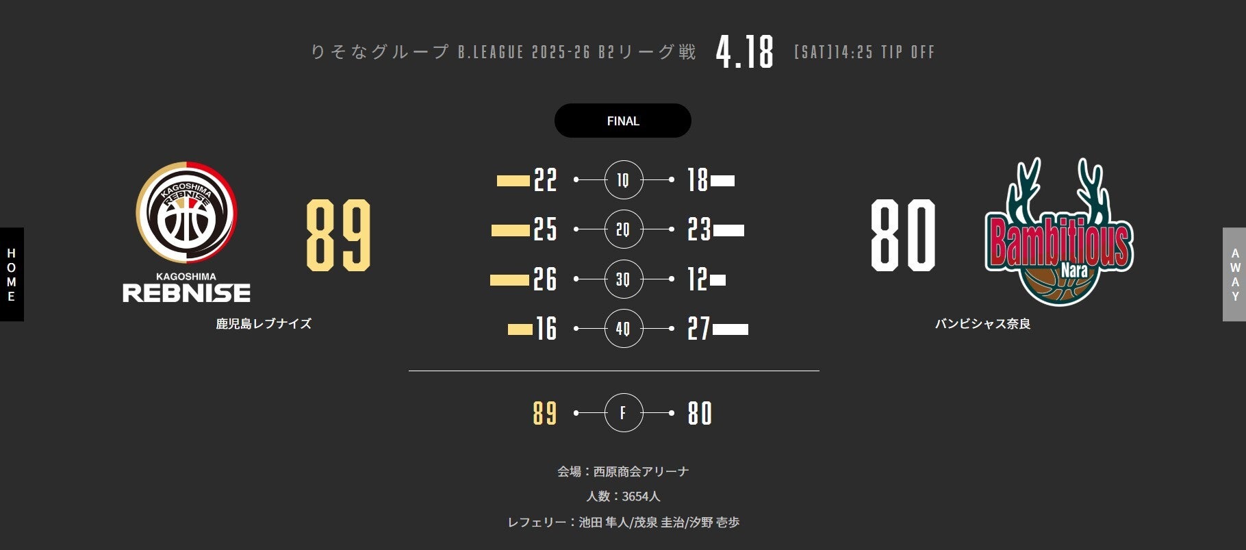本日(4/18)、りそなグループ B.LEAGUE 2025-26シーズン 第31節 西原商会アリーナでバンビシャス奈良と対戦しました。試合結果をお知らせします。