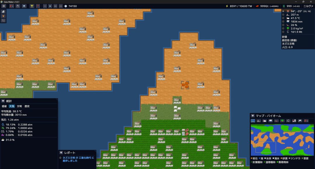 同じネズミ文明の間でも地域による差が生じていて、全世界が工業化ネズミ文明に覆われつつある中で砂漠にぽつんと鉄器ネズミ文明が息づいているのも見つけました。彼らもいつか滅びの道を辿るのでしょうか。今ある文明も時代の波に飲まれて消えていくのでしょうか。私の小さなPCの中で、なんだか歴史が生まれているような気がしてしまいます。