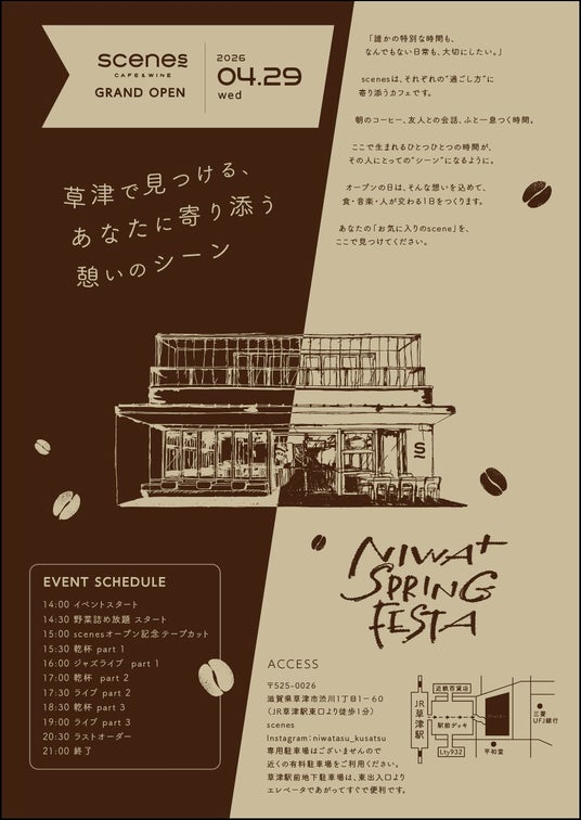 当日は新施設「scenes CAFE & WINE」のグランドオープン当日。音楽、食、そして地域の人々が交差する、笑顔あふれる「草津の春祭り」の全貌をご紹介します!