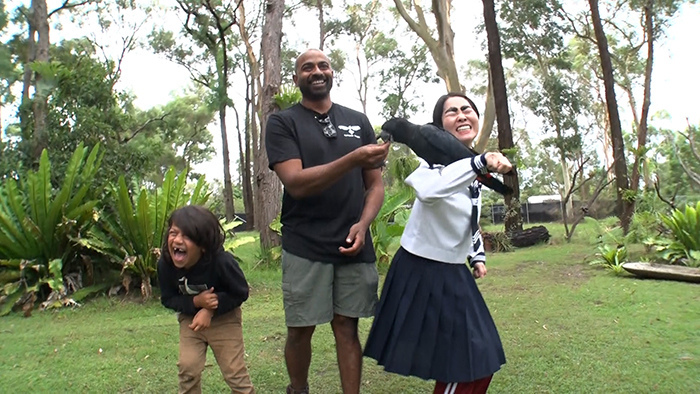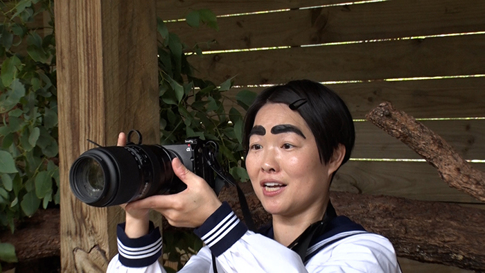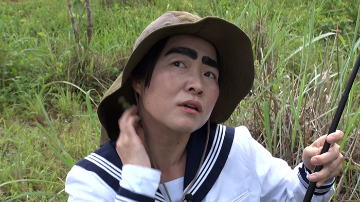 そして最終日。エリマキトカゲの探索開始から1時間。ついに草むらに潜む姿を発見!なんとか全身を捉えようとするが、草むらをかき分け逃亡。ここで作戦決行!木に回り込んでスタンバイ。ところが向かったのは木ではなくイモト!さらにそのまま体によじ登る。
