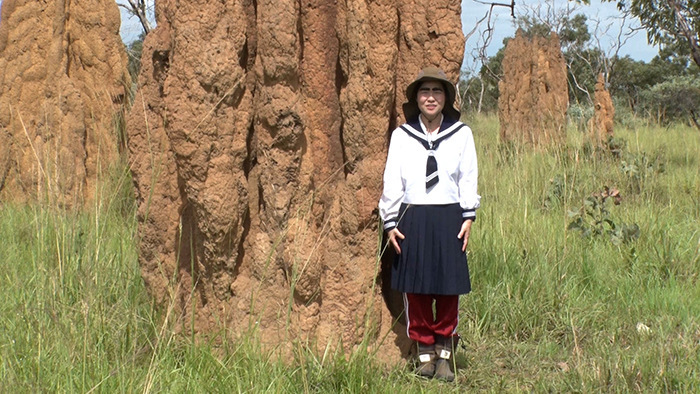 道中で見つけたのが、聖堂シロアリの蟻塚。大きなものには200万匹ものシロアリが暮らしているという。聖堂シロアリはこの地域の先住民にとって貴重なタンパク源。人気の理由はその味わいにあり、イモトも実際に食べてみることに。せっかくなのでスタンプもゲット!
