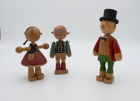 カイ・フランク 《テュット(女の子)》(左)、《ポイカ(男の子)》(中央)、《シルクスティレヒトーリ(サーカス座長)》(右) 木製人形 1945年 ©Architecture & Design Museum Helsinki