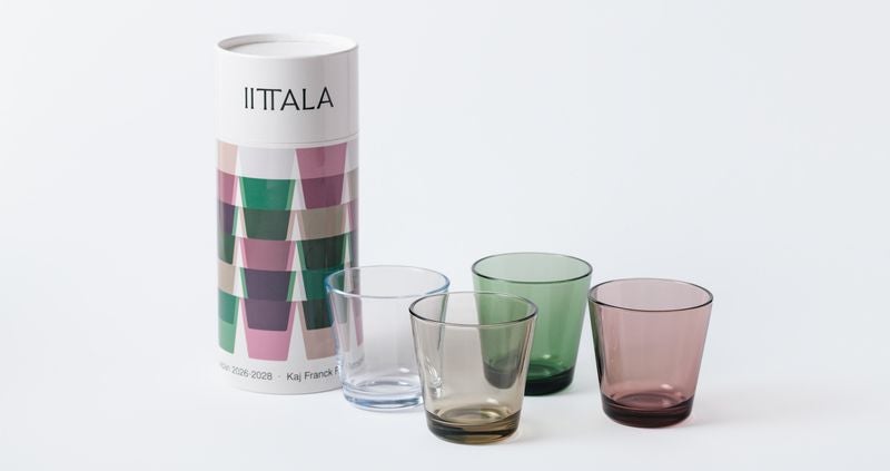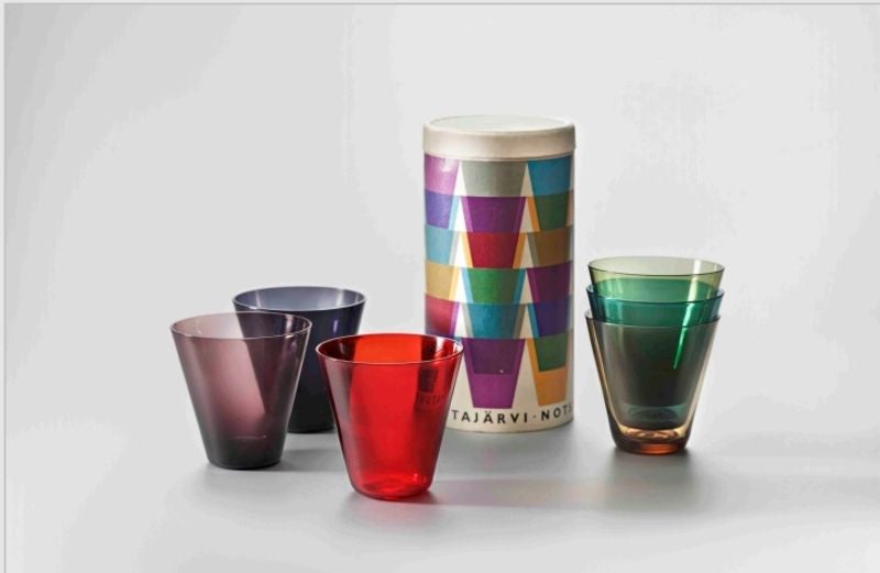 カイ・フランク 《キマラ(カクテル)》タンブラー 1953年、カイ・フランク/サーラ・ホペア 《トイヴェ(希望)》パッケージ 1955年 ヌータヤルヴィ・ガラス製作所 Photo: Rauno Träskelin ©Architecture & Design Museum Helsinki