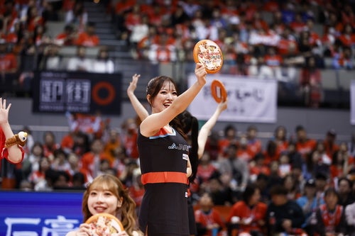 第4Qオフィシャルタイムアウトでは、「ピザポケット presents ピザフリスビーチャレンジ」を実施いたしました。モヒカンアビィとD*Flareが客席にピザフリスビーを投げ込み、見事キャッチされた方にはピザポケット広島北店で使えるピザ無料券がプレゼントされました。