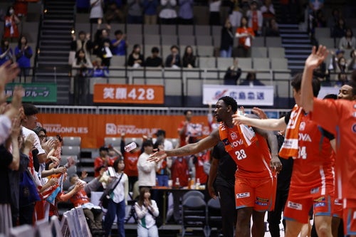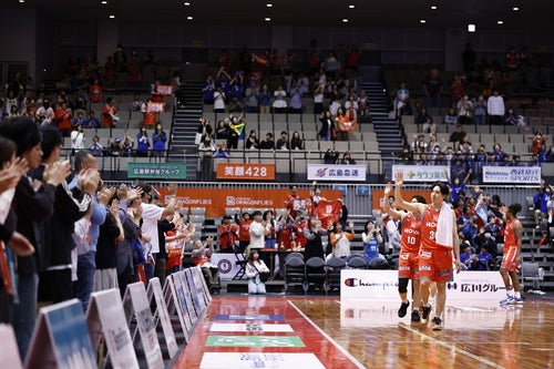 広島ドラゴンフライズは、熱い戦いを繰り広げてくれたアウェイチームへリスペクトを込めて、スタンディングオベーションでお送りしています。