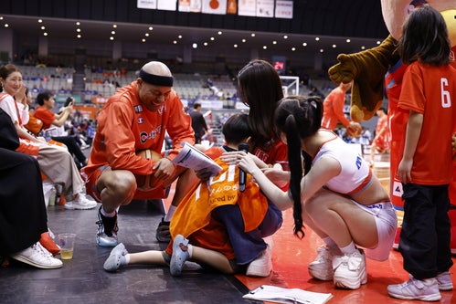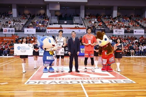 試合開始前には、両チームのキャプテンによるおりづる交換が行われました。試合を通して最もリスペクトに値する選手を表彰する「ヒロマツホールディングス presents おりづる賞」は、広島ドラゴンフライズ 市川真人 選手、島根スサノオマジック 中村太地 選手が受賞しました。