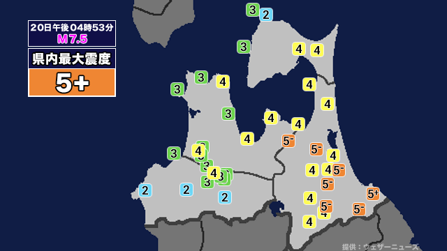 【地震】青森県内で震度5強 三陸沖を震源とする最大震度5強の地震が発生 津波警報等発表中