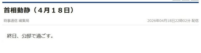 時事通信が何のステマなのか知らないが、「中東情勢緊迫、高市首相が活発外交」という記事を出し、あたかも高市早苗が働いているかのような印象を与えていたのだが、せめてもの抵抗なのか知らないが、関連記事的に首相動静のリンクが貼ってあって、高市早苗は終日お休みだった。大本営発表やめてくれ!(2枚)