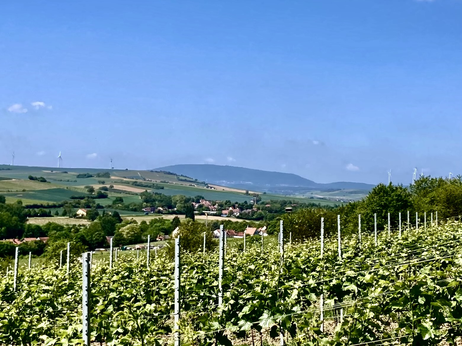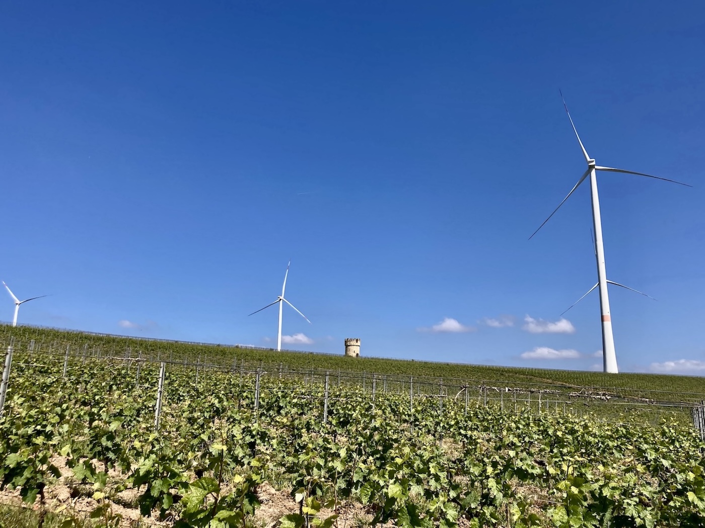 クラウス=ペーターと最初に向かったブドウ畑は、クラウスが妻のヘードヴィヒ(ヘディ)とともに、魅惑的なリースリングを生み出してきたフーバッカーだ。あたりを見渡すと、かつてはなかった風力発電機が林立しており、遠くに見えるビブリス原発は、2011年の福島第一原子力発電所事故の直後に廃炉となっていた。