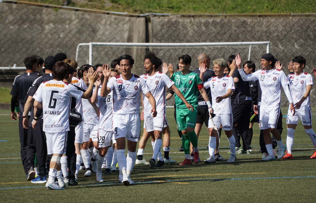 リーグ戦初勝利を喜ぶ「IKOMA FC 奈良」の選手ら=4月18日午後、奈良県御所市の市民運動公園(西川博明撮影)