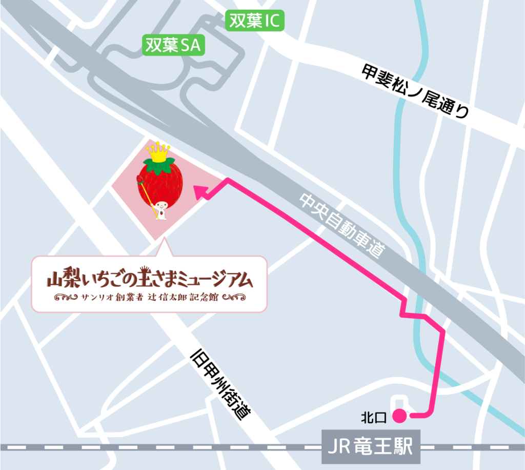 「山梨いちごの王さまミュージアム」のある場所は、辻󠄀信太郎さんが生まれ育った山梨県甲府市の隣町・甲斐市にあります。最寄り駅は中央線のJR竜王駅ですが、駅からは徒歩で約25分と少し距離があるので、できれば車での来館がおすすめです。中央自動車道 双葉インターチェンジより車で約5分 、甲府駅からタクシーで20分です。