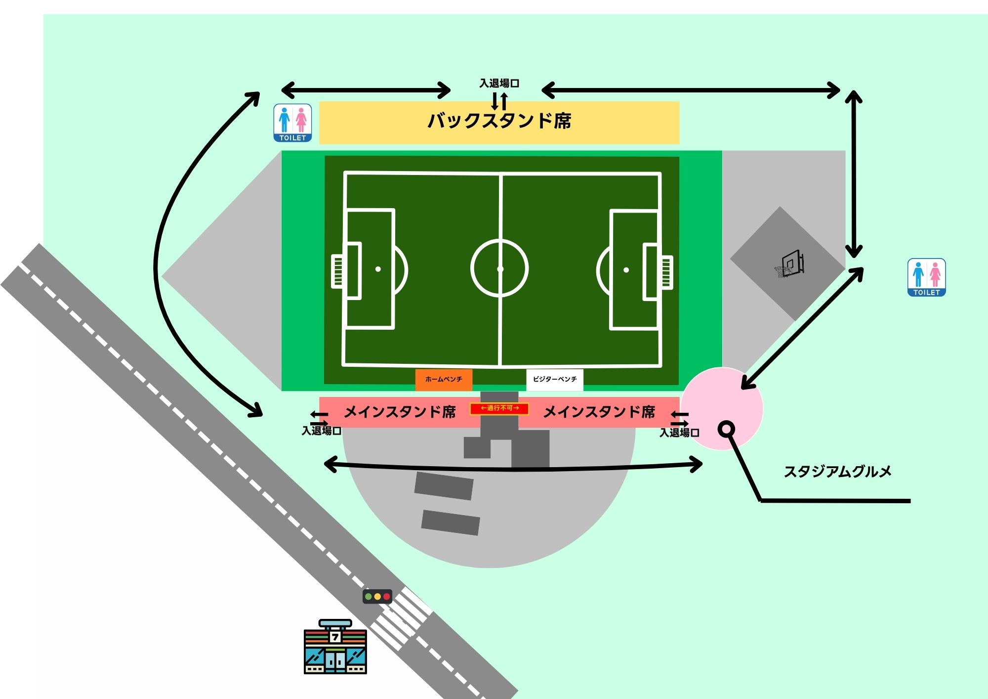 メインスタンド中央通路は通り抜けできませんので迂回をお願いします。