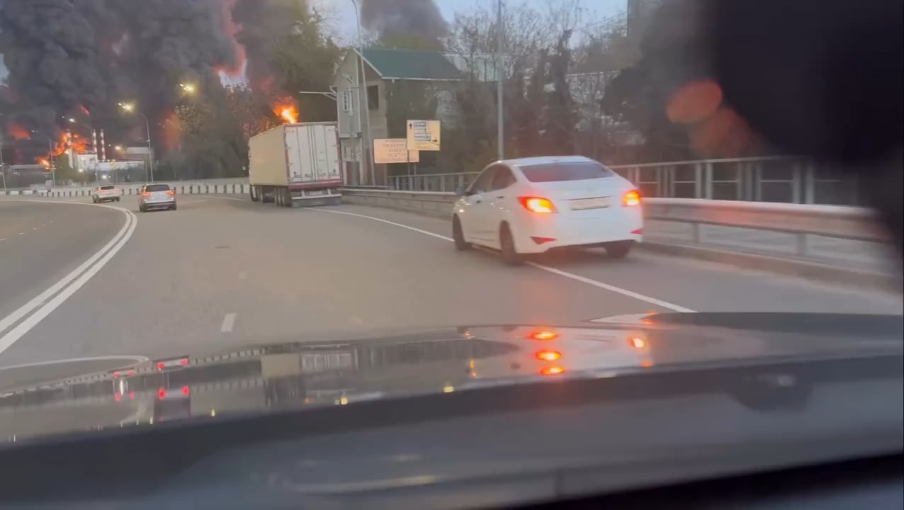 ロシア民間人が今朝、クラスノダール地方トゥアプセにあるロスネフチ製油所の大規模火災を車の中から撮影した。