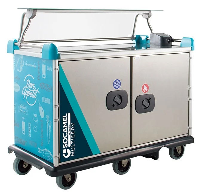 「マルチサーブ」は新しいタイプの配膳車。再加熱・配膳・盛り付け台が一体となった再加熱ワゴンです。病院・高齢者福祉施設の食事提供において、業務の効率化による「人手不足の解消」と、対面盛り付けによる「サービス向上」の両立が図れます。食堂やデイルームで盛り付けしながら食事提提供する施設様に最適です。