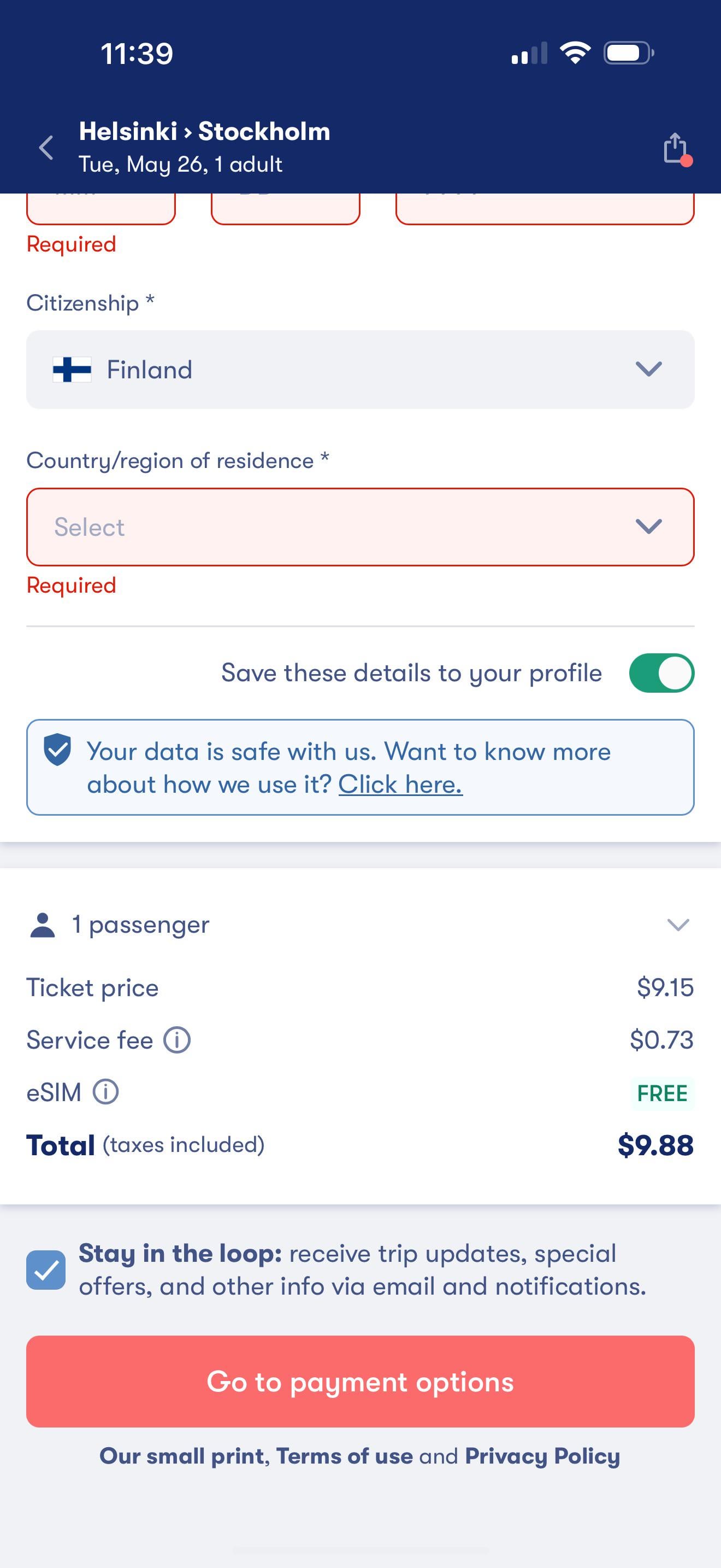 Omioは無料のキャビンを提供しており、キャビンと一緒にヘルシンキからストックホルムまでの片道フェリーチケットはわずか9ドルですが、バイキングラインの公式Webサイトでは、同じ日の約50ユーロ以上と表示されています 誰かがOmioのようなサードパーティアプリでヘルシンキからストックホルムに旅行したことがあり、問題に直面していないかどうか知りたいですか? Finland