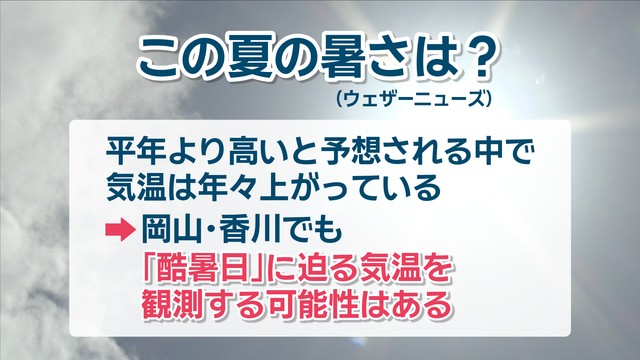 さて、この夏の暑さは、といいますと、民間の気象予報会社ウェザーニューズは2026年の夏は平年より高いと予想される中で、気温は年々上がっているため岡山・香川でも「酷暑日」に迫る気温を観測する可能性はあるとしています。