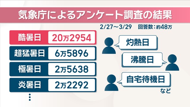 候補の中で「酷暑日」は得票数が20万を超えました。このほかには、灼熱日や沸騰日、自宅待機日などの意見もあったということです。