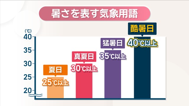 暑さを表す気象用語は、これまで最高気温が25℃以上の夏日、30℃以上の真夏日、35℃以上の猛暑日がありました。そしてこのたび40℃以上を「酷暑日」と決めました。