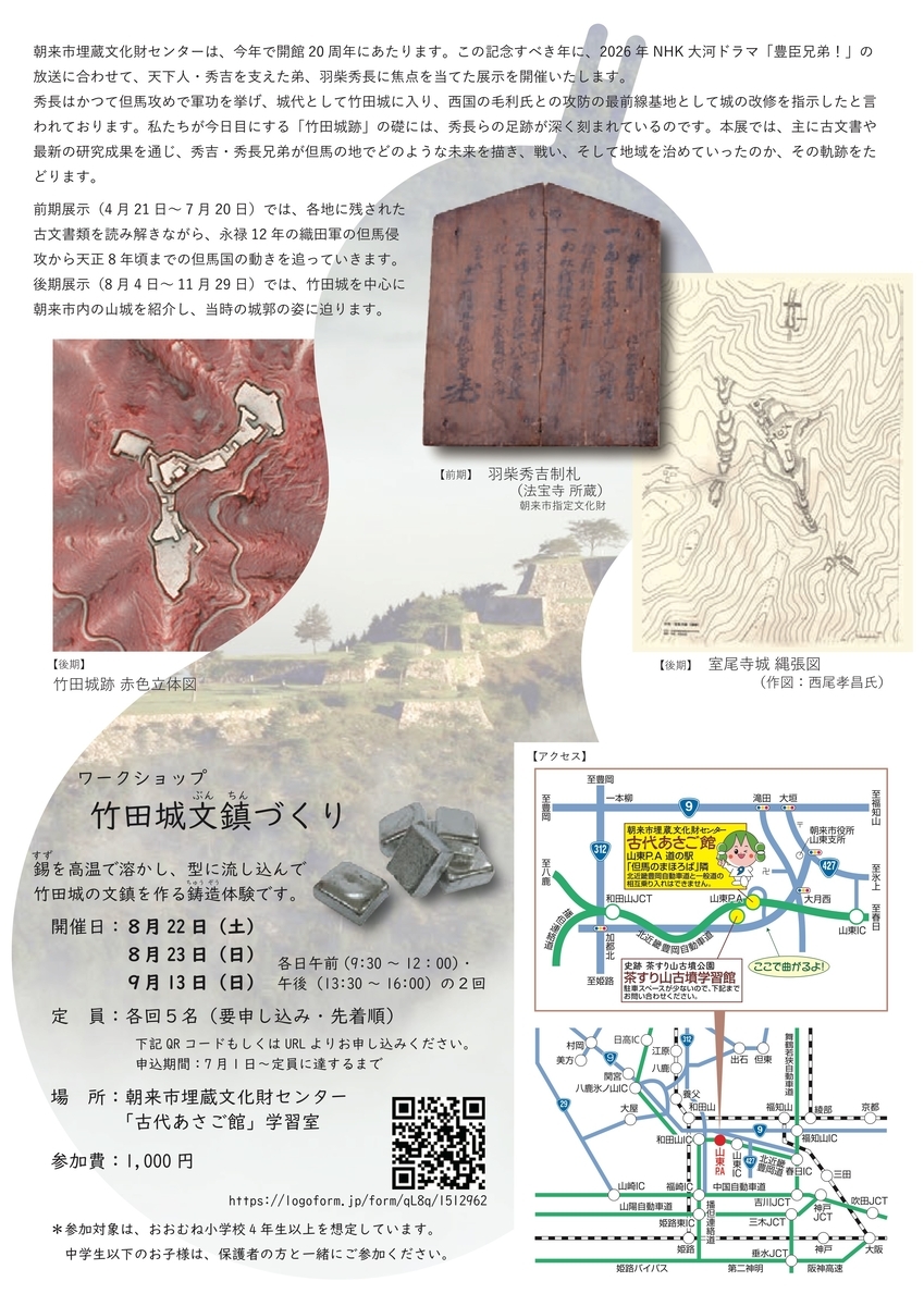 4月21日(火)から11月29日(日)までの間、朝来市埋蔵文化財センター「古代あさご館」(兵庫県朝来市山東町)において朝来市埋蔵文化財センター20周年企画展「羽柴秀長と竹田城」が開催されます。入館無料。