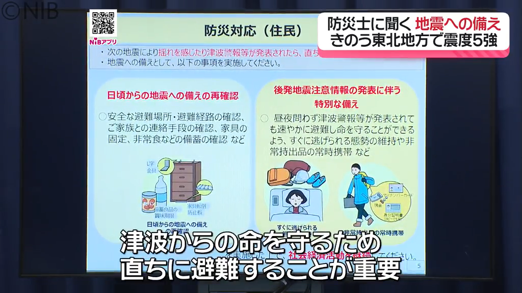 「すぐに逃げられる態勢の維持、 非常持ち出し品の常時携帯などをお願いします。防災対応を取るべき地域の方々は、揺れを感じたり、 津波警報等が発表されたら、津波からの命を守るため直ちに避難することが重要です」