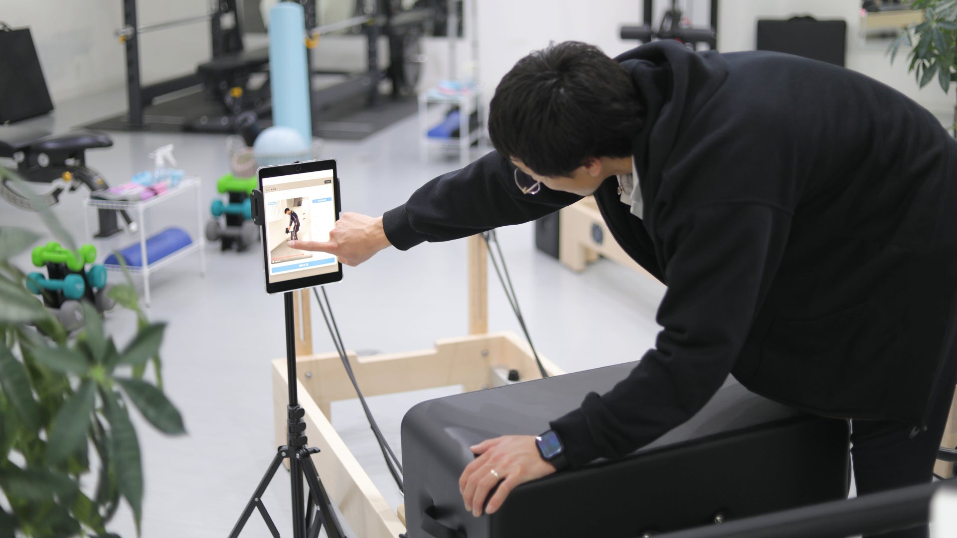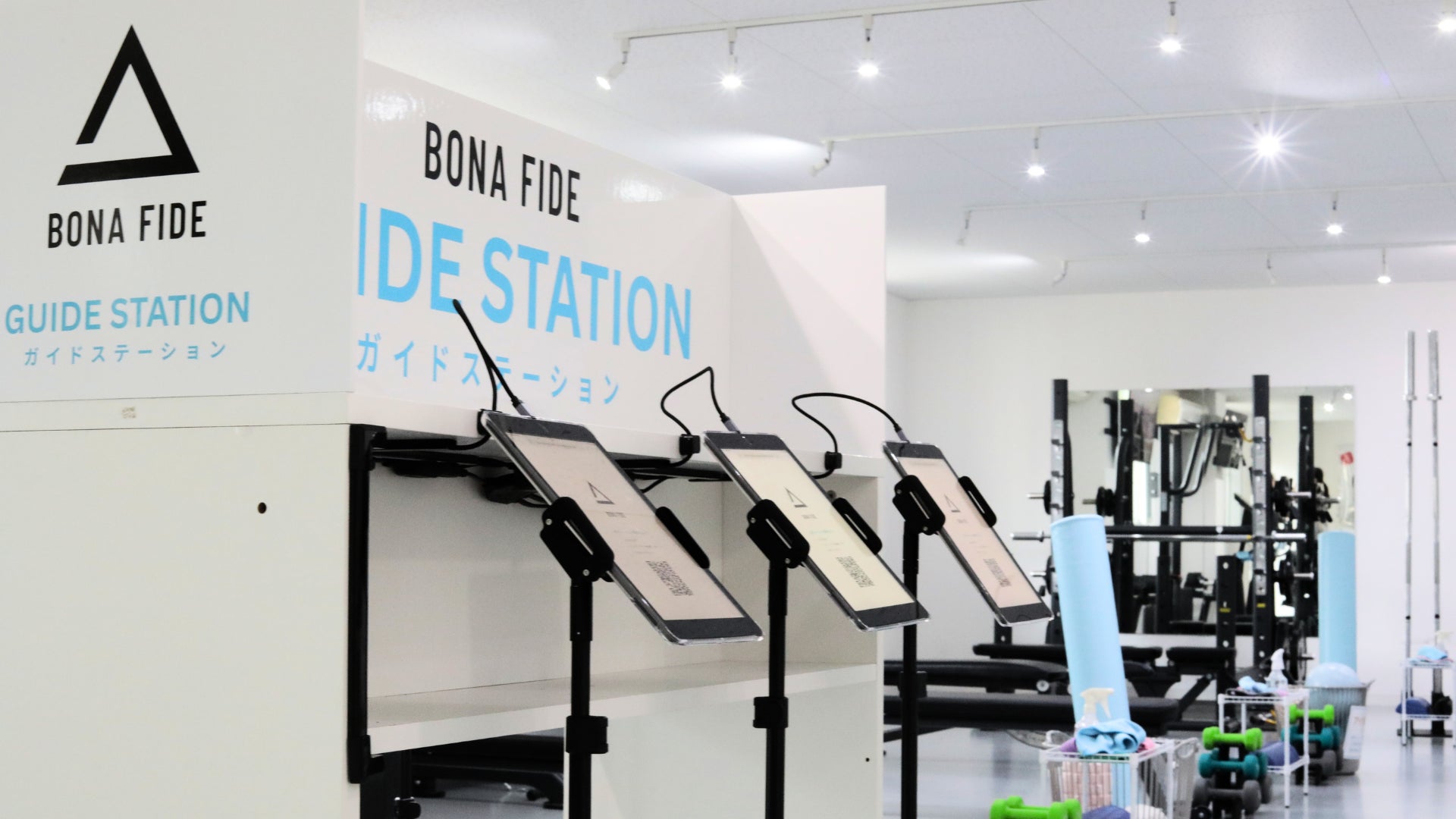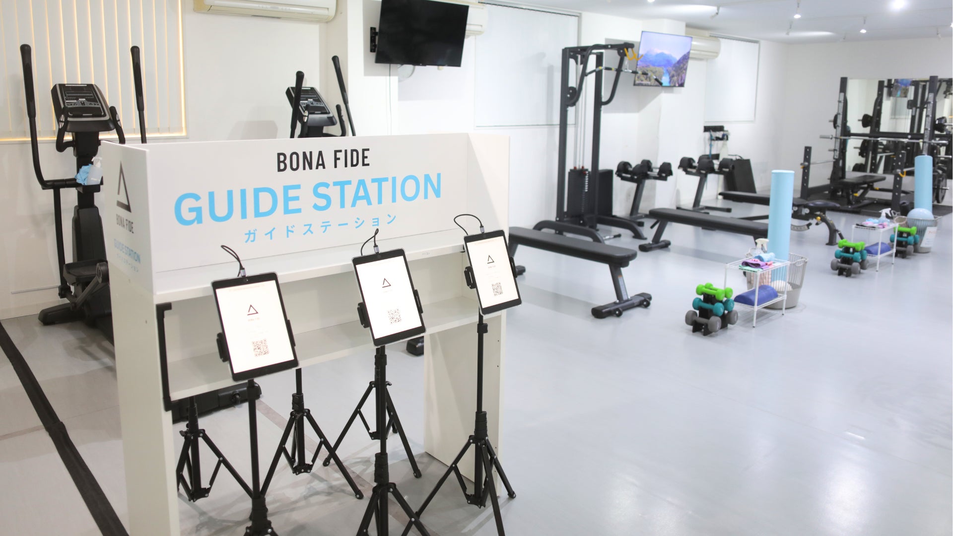 メニューを表示するガイドステーションとジム店内