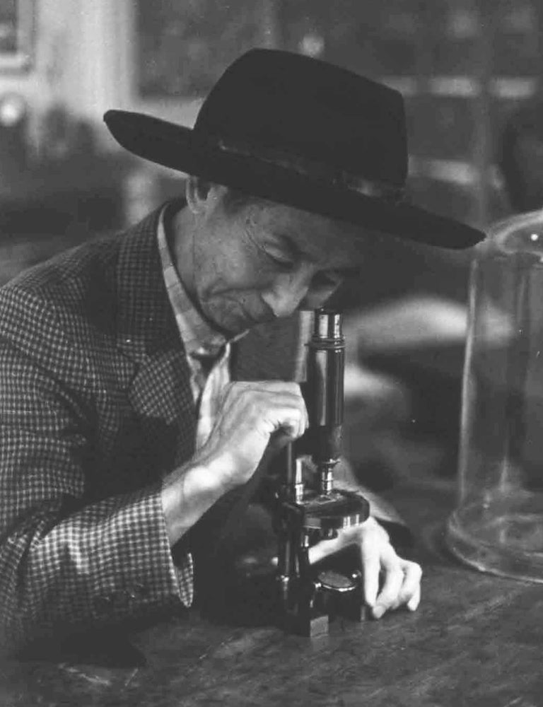 「J.H. ファーブル展」の会場でファーブルの帽子をかぶって顕微鏡をのぞく熊田千佳慕(1989年) ©Chikabo Kumada