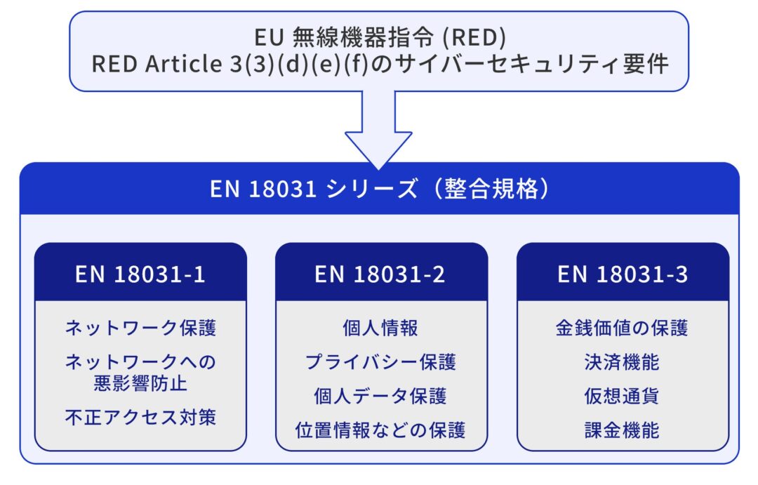 EN 18031シリーズは、2025年1月に欧州委員会により整合規格として採用されたサイバーセキュリティ規格であり、特に無線機器におけるセキュリティ要件を規定しています。このシリーズは以下の三つの規格で構成されています。